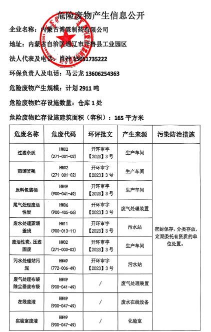 内蒙古博霖制药有限公司危险废物产生信息公开